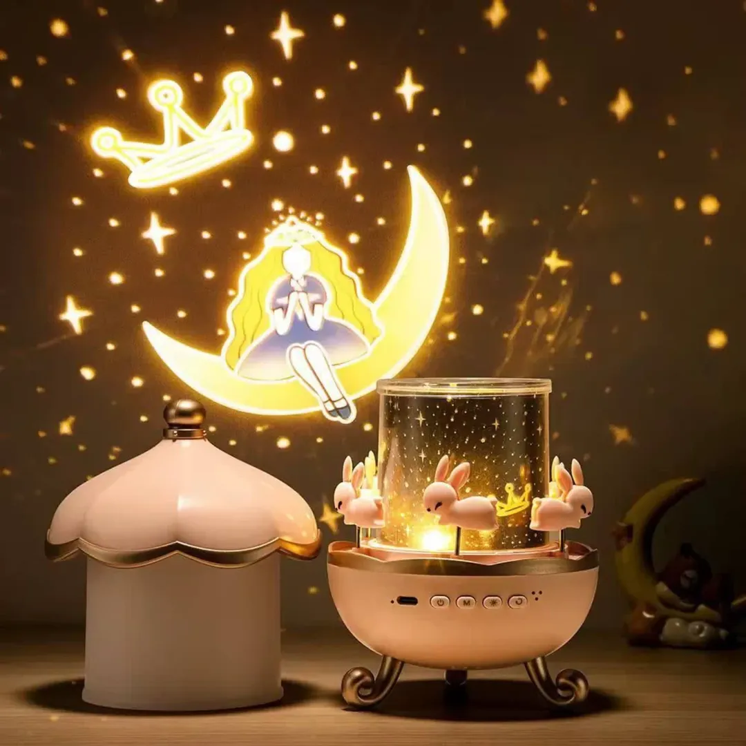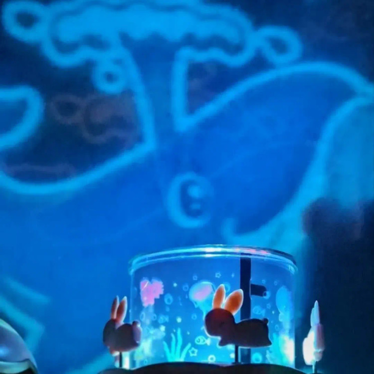 پروژکتور کاروسل خرگوش چراغ خواب با طراحی فانتزی و بدنهی باکیفیت ABS ظاهر قشنگ و خاص پخش نور ملایم از داخل جعبه داخل جعبه ۱۲ اسلاید کارتونی مختلف موجود هست